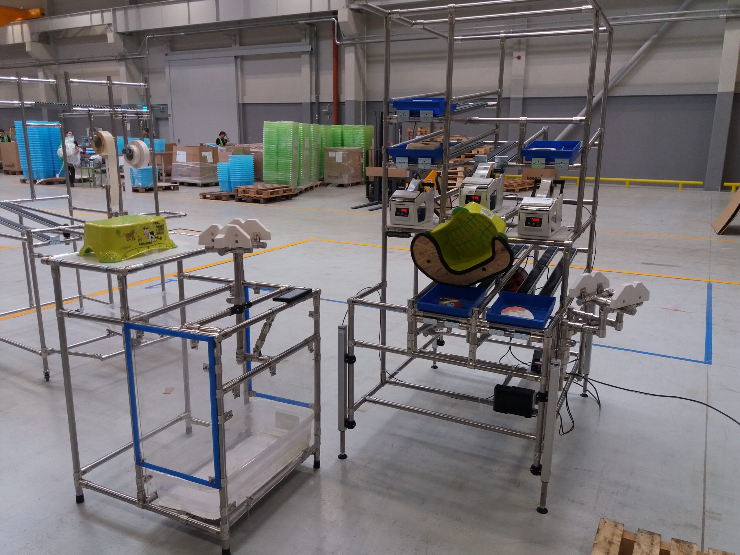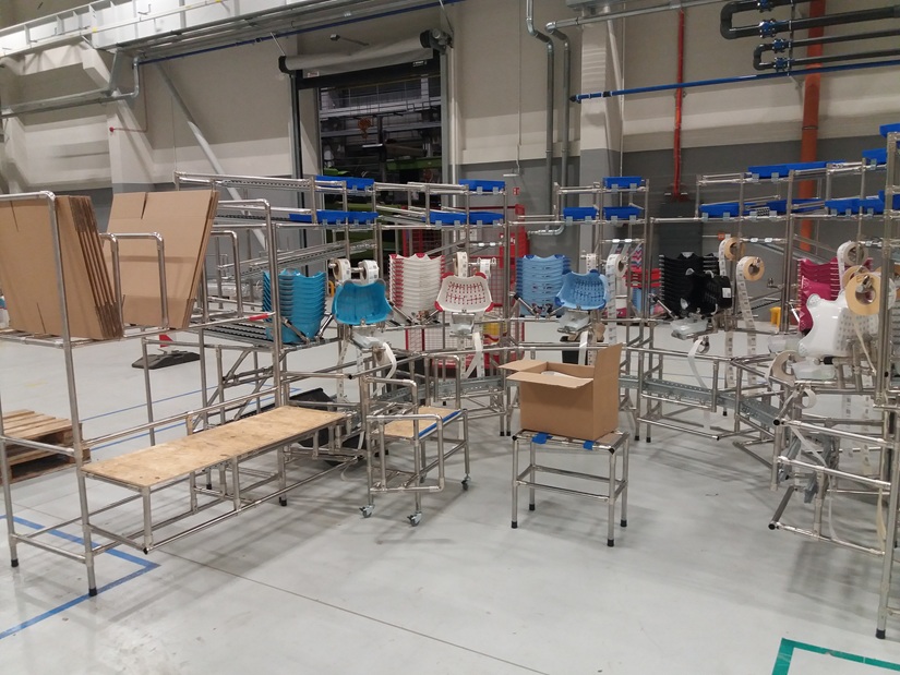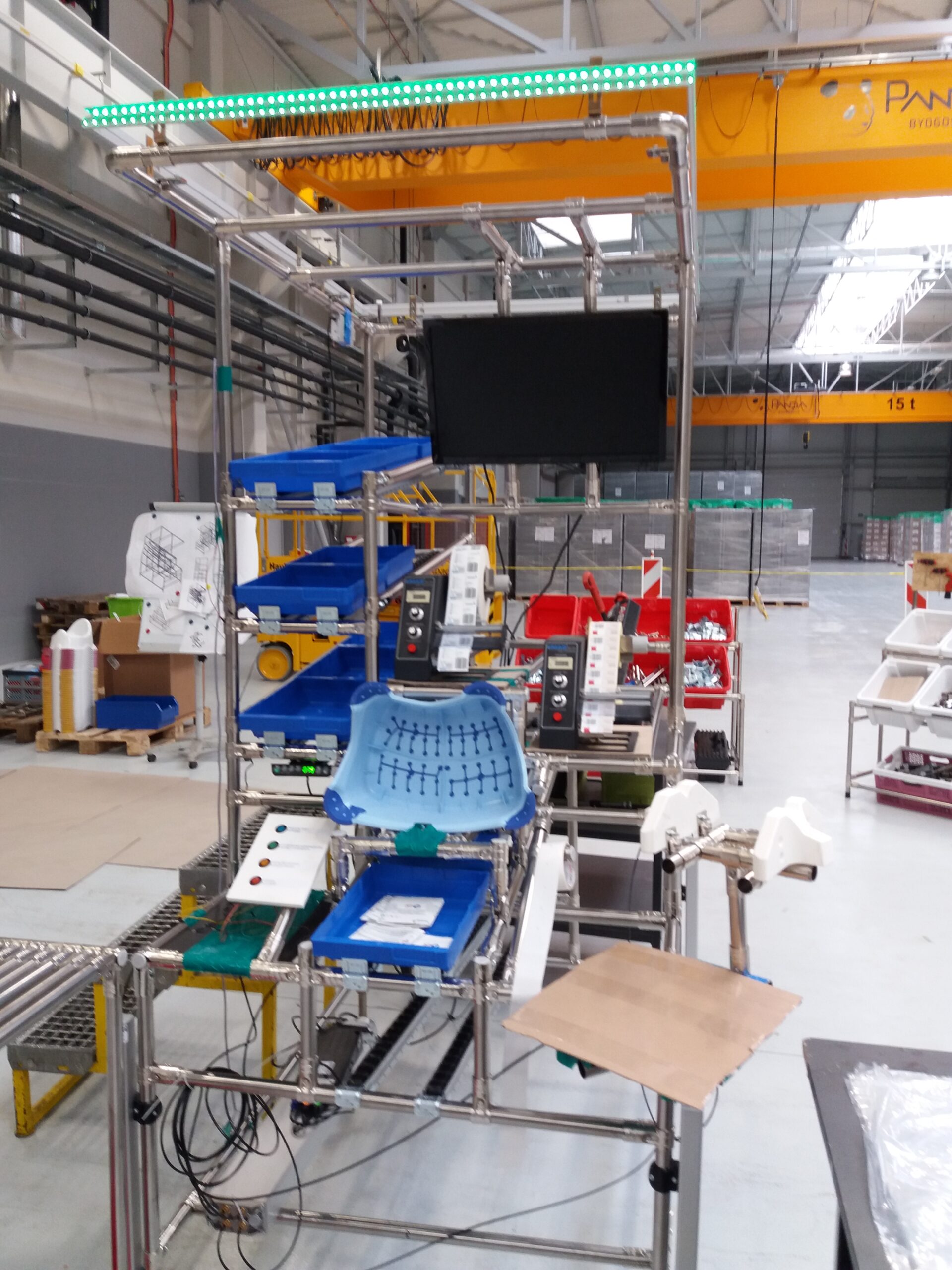 The system was based on Beevatec modular pipe structures, enabling rapid reconfiguration and adaptation to changing product variants. The project applied Lean Manufacturing principles, focusing on waste reduction, visual management, and operator efficiency.